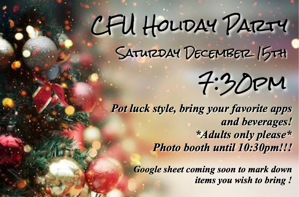 Our Holiday Party is coming up very soon!! If you want to bring a dish please use the google sheet below to fill out what you wish to bring so we don’t have doubles. Do not feel obligated to bring anything.