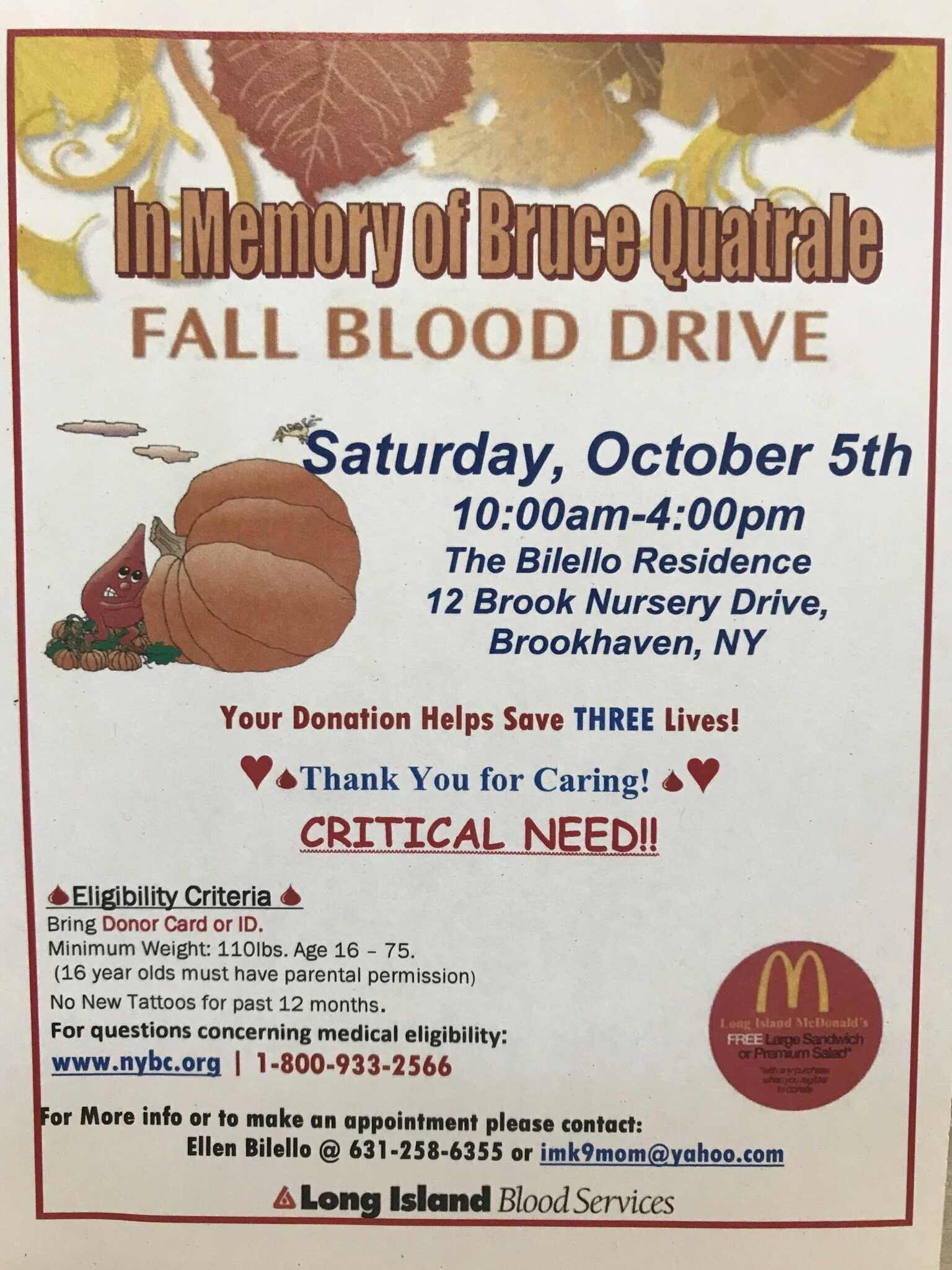 The Bilello house is hosting their annual blood drive this Saturday October 5th. Contact Ellen for more info or to schedule a time to head down and donate! Check out the flyer for details!