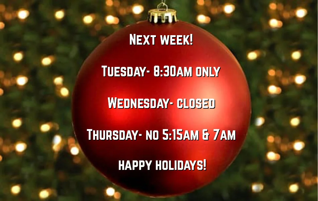 Less than a week away until Christmas already!!! Reminder that Tuesday we will be running a 8:30am class only. Christmas Day we are closed. And Thursday there will be no 5:15am or 7:00am classes.