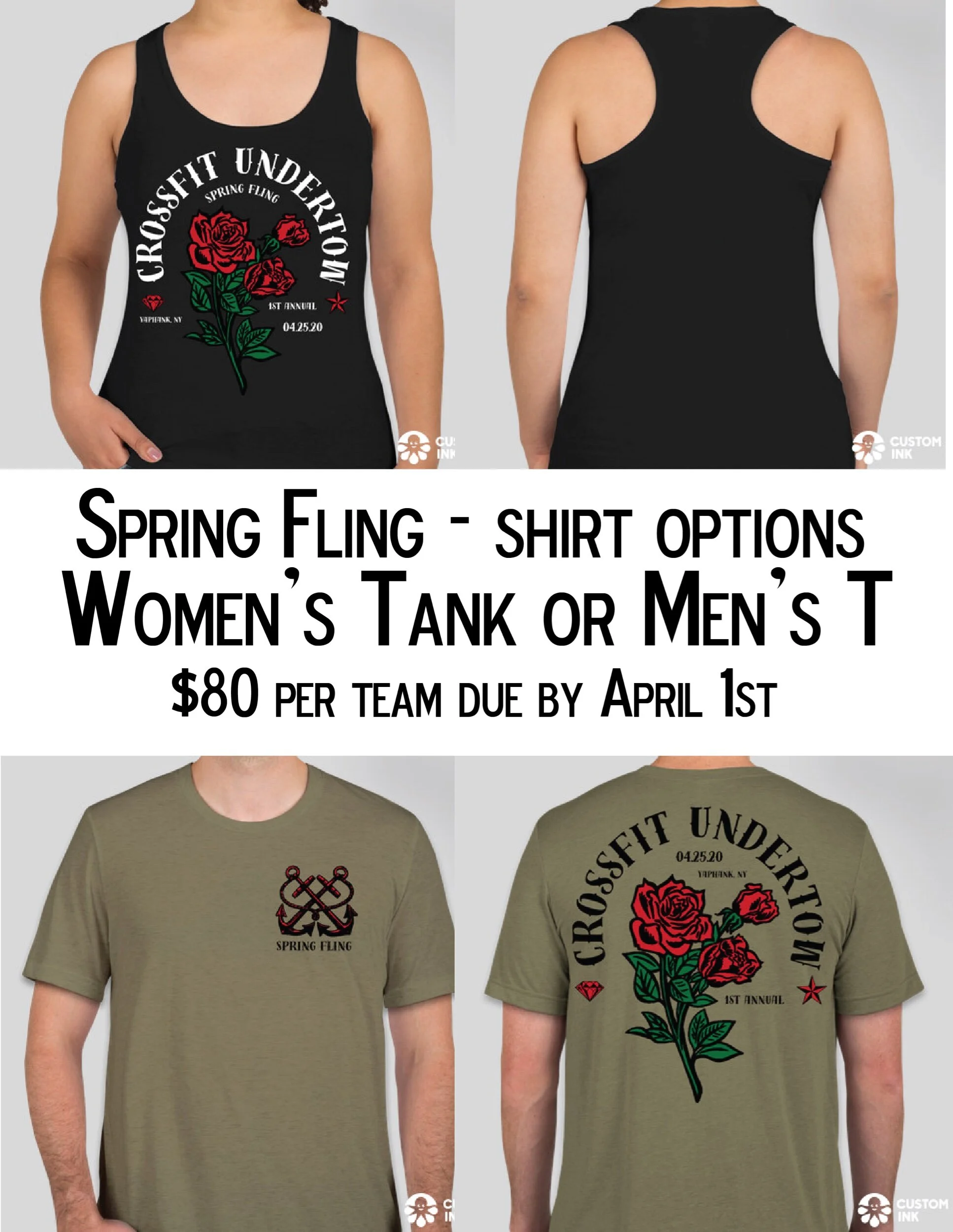 Teams have been hitting the sign up sheet for the Spring Fling! Have you found a partner yet? We can help if you can’t find one! Don’t forget to write down your shirt order too! Ladies you have a choice between a regular T or a Tank!! Both items are triblend
