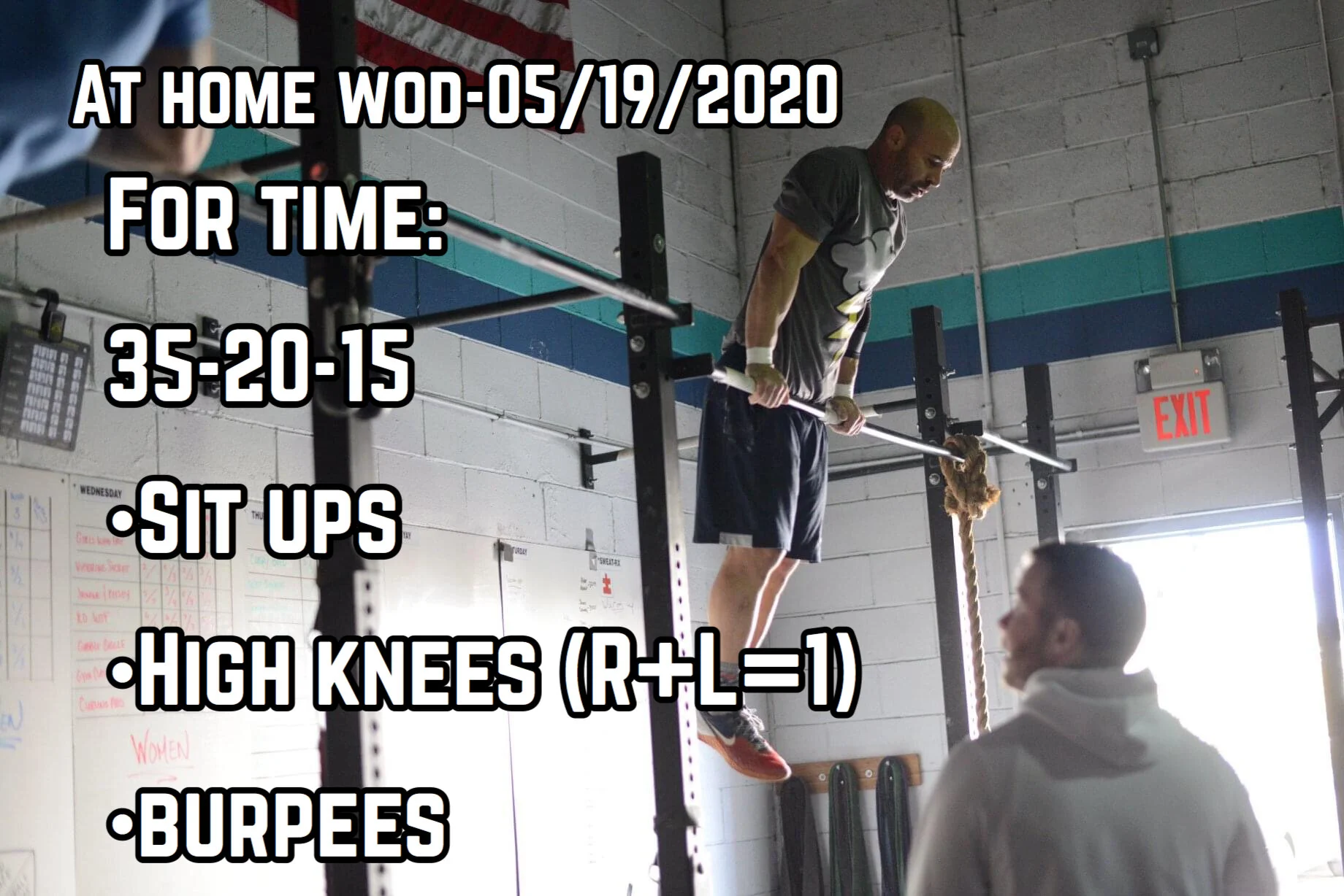 Tuesday May 19, 2020 by Domenique DeRosa At home wod- For time: 35-20-15 •Sit ups •High knees (R+L=1) •Burpees