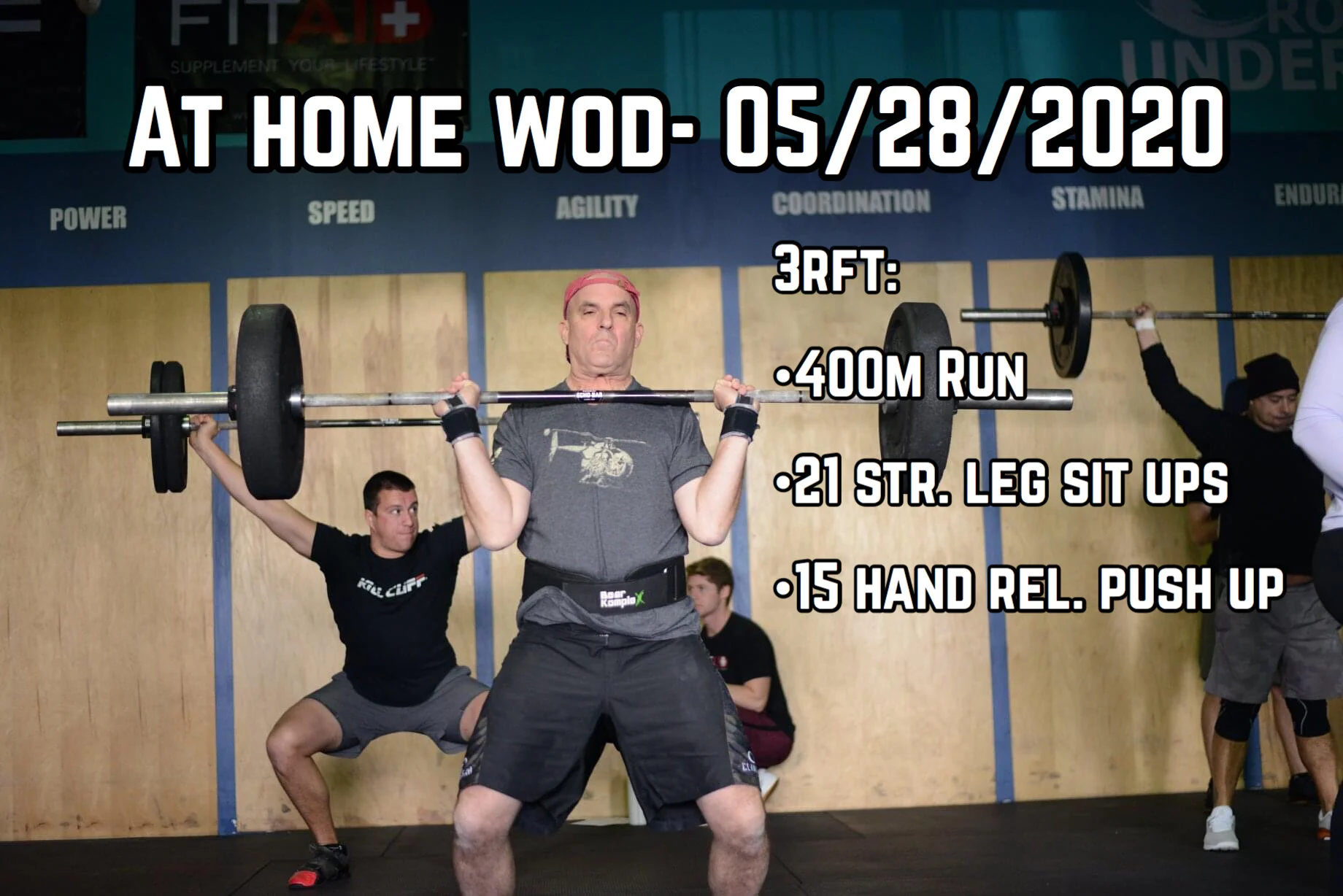 Thursday May 28, 2020 by Domenique DeRosa At home wod- 3RFT400m Run21 Straight leg Sit ups15 Hand release push ups