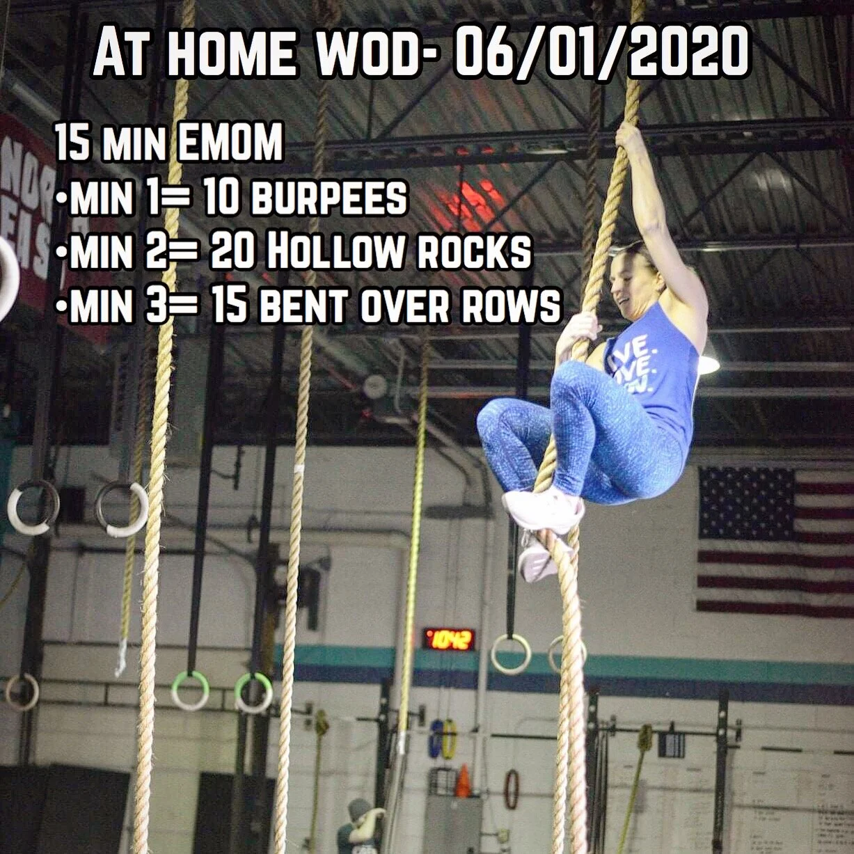 Happy june! June 01, 2020 by Domenique DeRosa At home wod- 15 min EMOM •min 1= 10 burpees •min 2= 20 Hollow rocks •min 3= 15 bent over rows