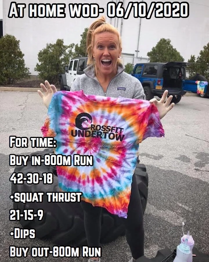 Wednesday June 10, 2020 by Domenique DeRosa At home wod- for timeBuy in- 800m run42-30–18Squat Thrust21-15-9DipsBuy out-800m Run