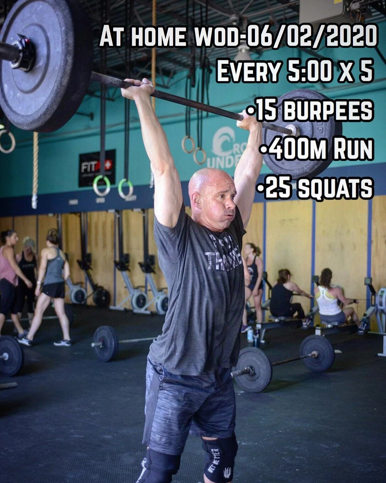 Tuesday June 02, 2020 by Domenique DeRosa At home WOD- Every 5:00 x 5 •15 burpees •400m Run •25 squats