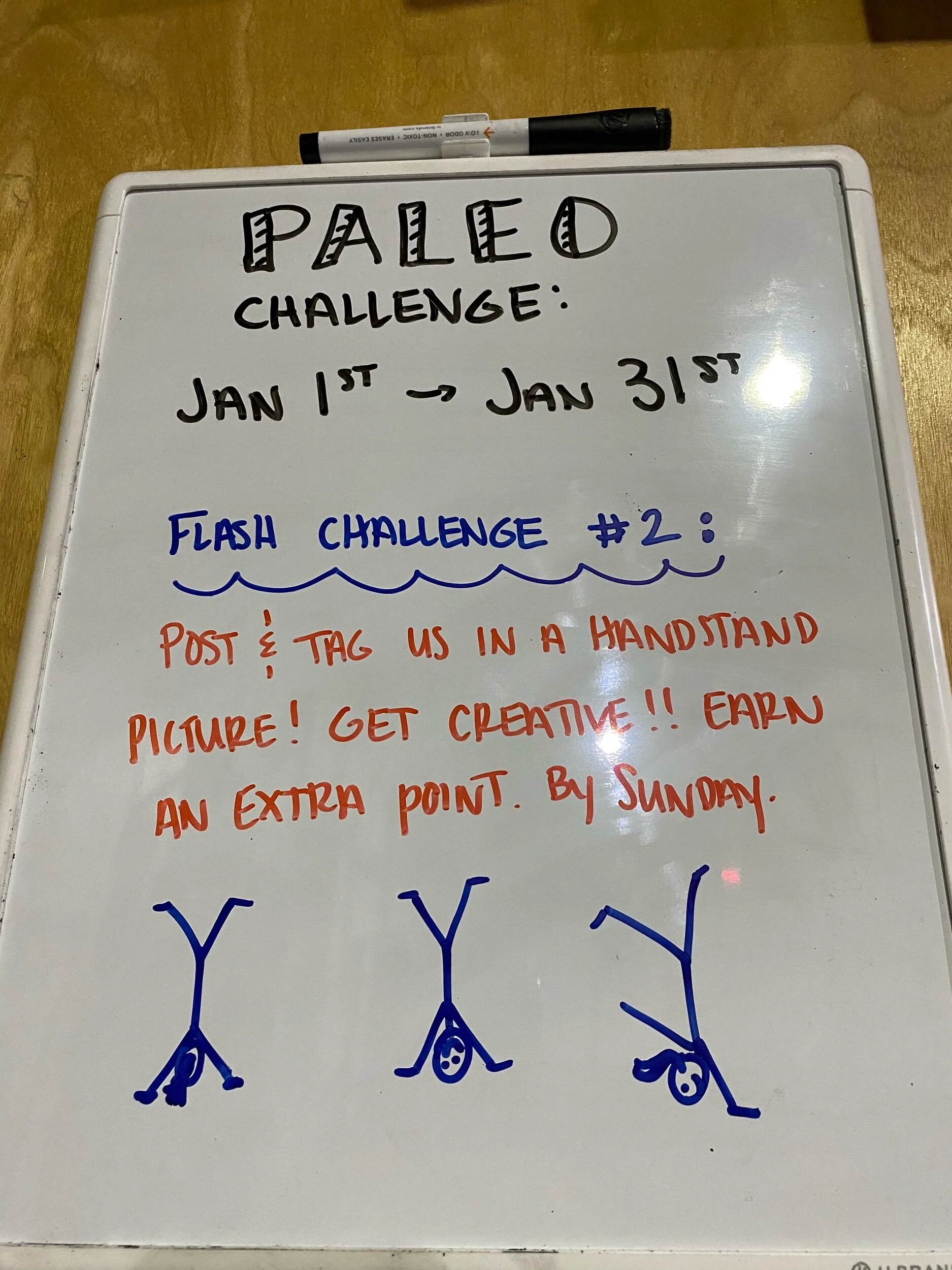 Paleo peeps! Get creative with this one. Post/send/tag us in a handstand picture! Rather than kicking up or wall walking against your living room wall we’re challenging you to surprise us with something fun. At a cool location, adding props, with others, etc… you have through Sunday to earn an extra point !