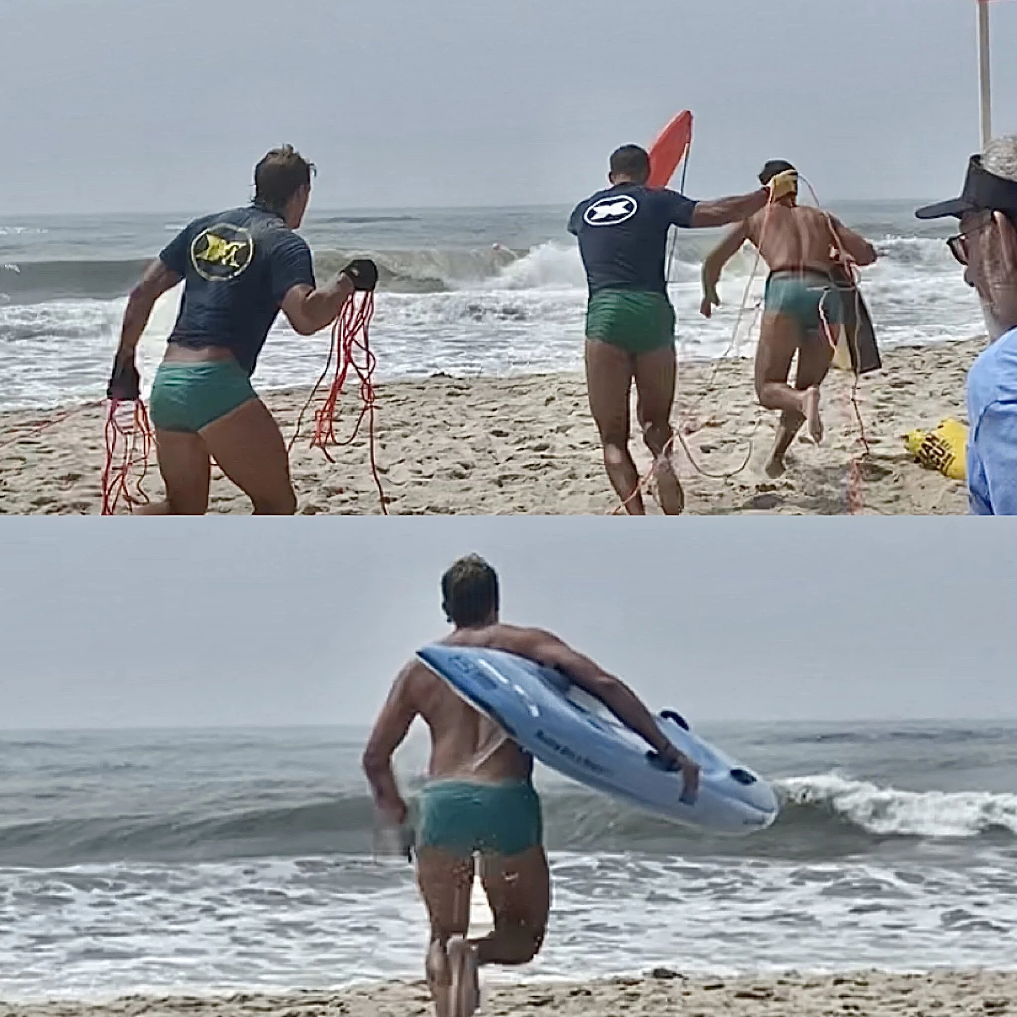Coach pat getting ready to go for the landline event (top) and heading out into the break for the board relay (bottom)