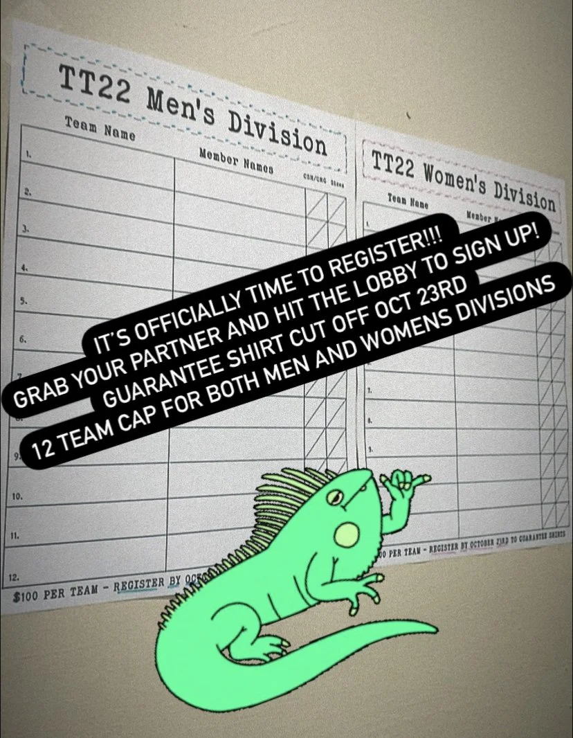 TT22 Sign-up sheets are now up in our lobby! 12 team cap for both mens and womens divisions. This is an “all levels” competition. Sign up by October 23rd to guarantee your annual long sleeve shirt!