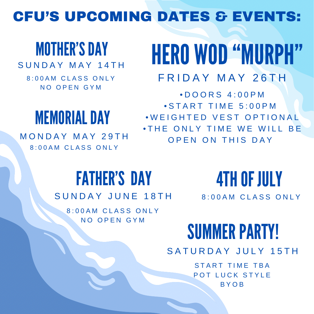 Due to the Spring Fling this Saturday we will be moving our strength day up to tomorrow (Wednesday)