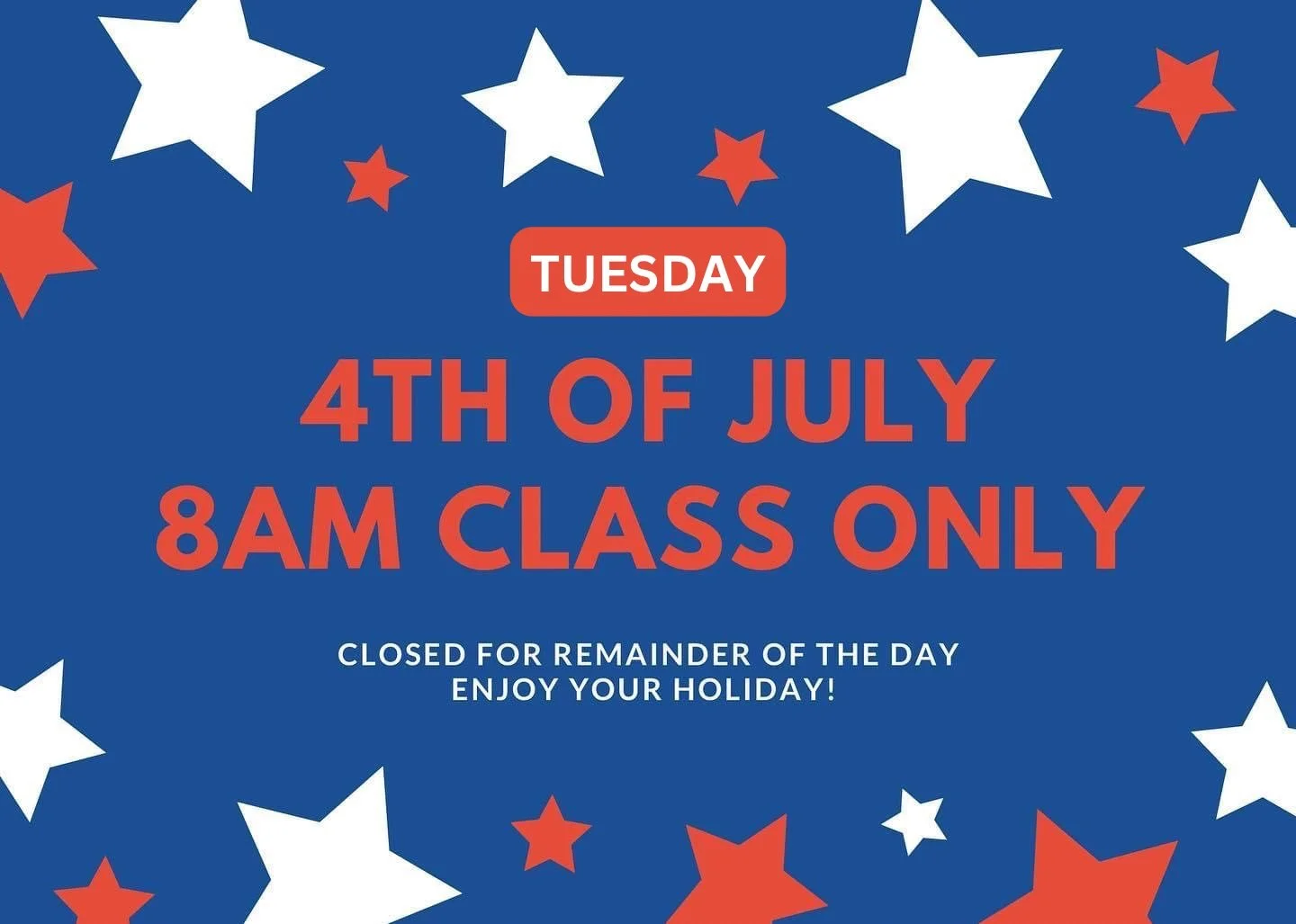 Happy Independence Day! Today there will be one class only at 8am. Enjoy your holiday!